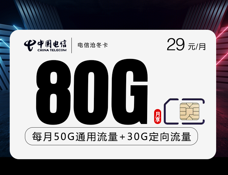 电信沧喜卡【流量可结转,长期套餐】产品套餐:29元80G+通话0.1原套餐29元30G定向流量,首月免费,套餐内容全到,套外流量5元/G,短彩信0.1/条,国内